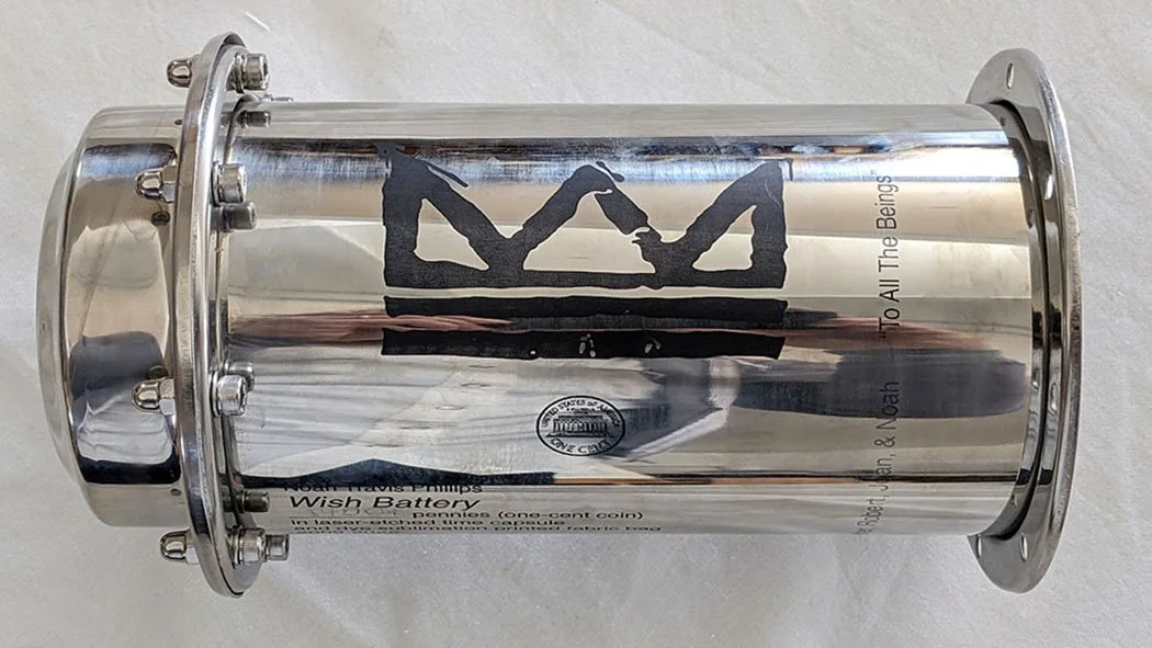 From elsewhere in the galaxy Mountain Water received a Wish Battery, made by artist Noah Phillips. Noah was a student in our Naropa University classes some years ago; he is now teaching at Rocky Mountain College of Art & Design. The Wish Battery contains over 1,400 good luck copper pennies found by Noah himself over the years, along with a message of generosity and good will. The pennies and message are contained in a custom-etched stainless steel time capsule buried near the Mountain Water building and adjacent to the remains of a century-old schoolhouse.  Visit Noah’s website for a more detailed description of the Wish Battery.